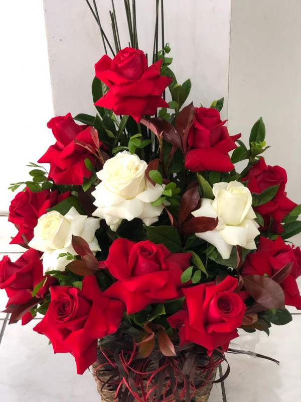 Arranjo de rosas vermelhas no cesto para entrega em Curitiba e região metropolitana até 22H. Neste modelo o cliente pode escolher a cor das rosas de preferência mas que tenha disponibilidade no momento.