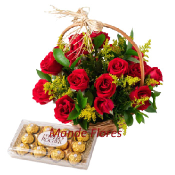 Arranjo com rosas vermelhas na cesta mais estojo de chocolate Ferrero Encomenda pra São José dos Pinhais, Araucária, Piraquara, Colombo, Fazenda Rio Grande. Atendemos todos os bairros de Curitiba e região metropolitana.
