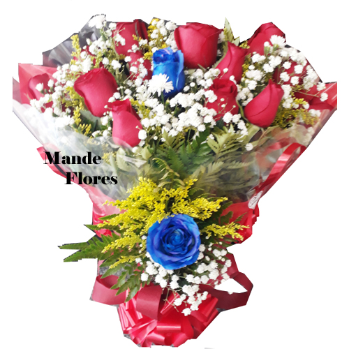 Buque com 12 rosas vermelhas decorado com detalhe azul. Arranjo especial de rosas para presentear um casal Faça sua encomenda ainda hoje deste lindo arranjo. Entregamos em Curitiba, São José dos Pinhais e Região Metropolitana.