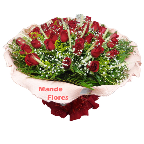 Buquê com 36 rosas vermelhas decorado com mosquitinho. Confeccionamos variados modelos com muitas rosas para surpreender seu amor. Antecipe e agende sua encomenda. Floricultura Mande Flores.