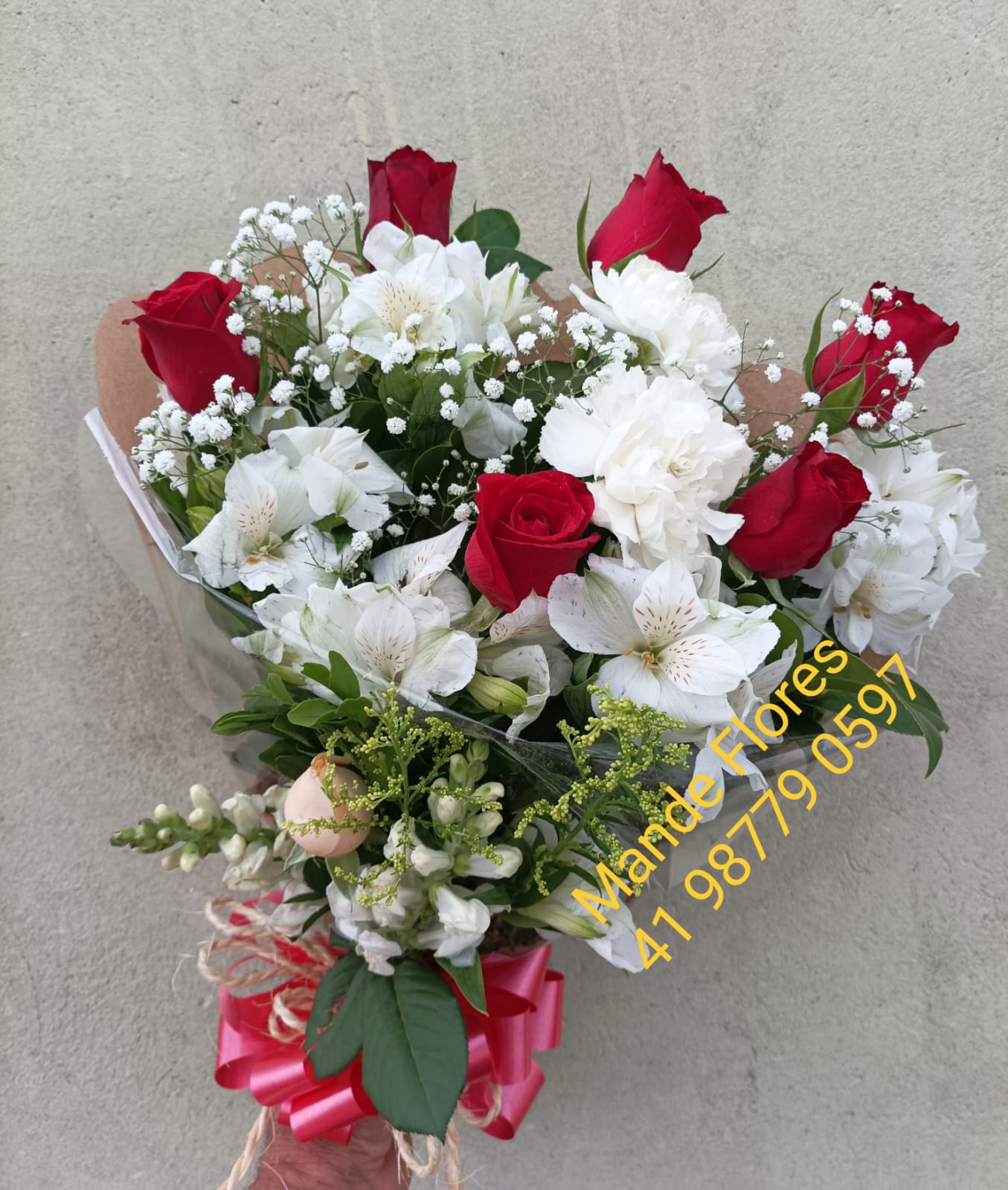 Buquê da paz e amor. Com rosas vermelhas e flores brancas para casais apaixonados e com briguinhas de amor