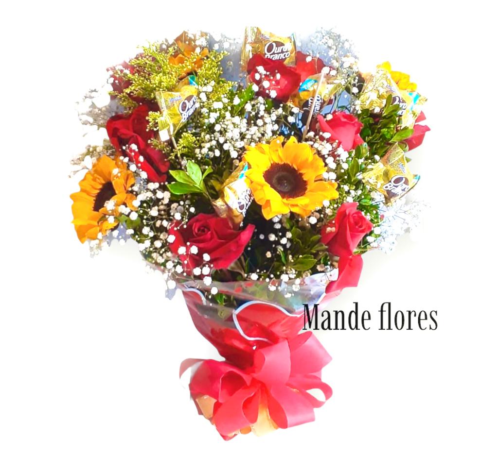 Flores mistas com girassóis e bombons distribuídos no meio das flores. Na Floricultura Mande Flores tem os mais lindos buques de flores coloridas