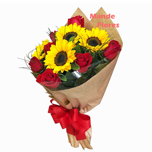 Buquê de girassóis com rosas vermelhas . Faça sua encomenda entre variados modelos disponíveis. Na Mande Flores tem buque de variados tipos de flores.