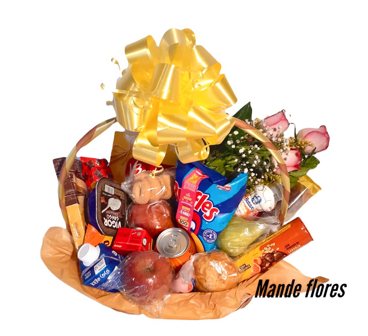 Cesta café mista com rosas, frutas, e outras delicias.
