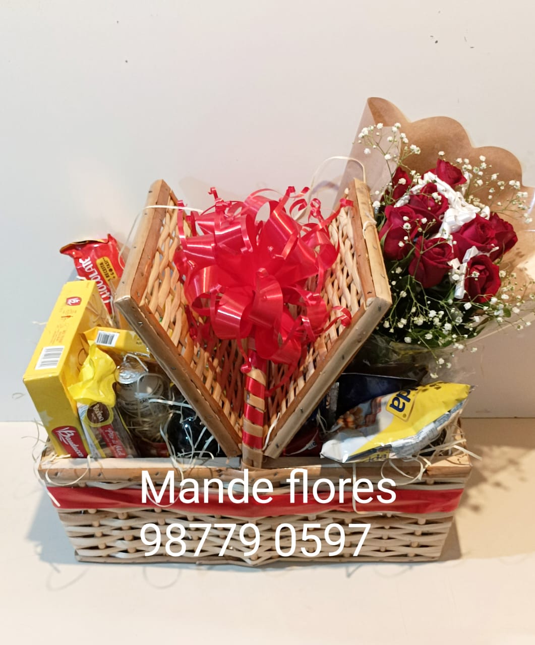 Cesta com variedades e delicias. Com biscoitos, pães, frutas, frios e muito mais. Um lindo buquê de rosas.