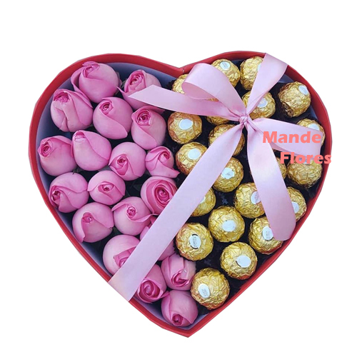 Caixa coração com chocolate e flores pra fazer feliz seu amor.