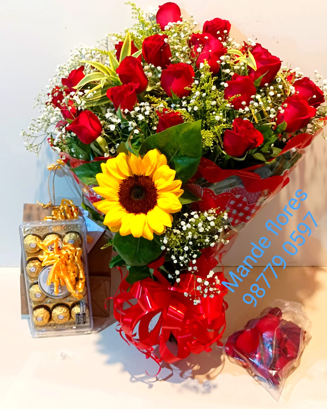 Arranjo choco lovers. Conjunto chocolate com rosas e pétalas. Bela composição com 24 rosas acompanhado com estojo de chocolate Com 24 rosas mais Ferrero na sacola e um pacote de pétalas. As pétalas acompanham este conjunto para criar um clima ainda mais romântico. Compre aqui na Mande Flores que garantimos a entrega no dia e hora determinados.