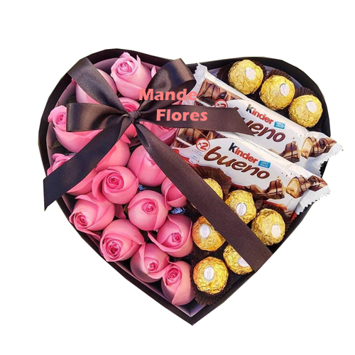 Mix de rosas com barras de chocolate no coração. Agendar encomenda com antecipação