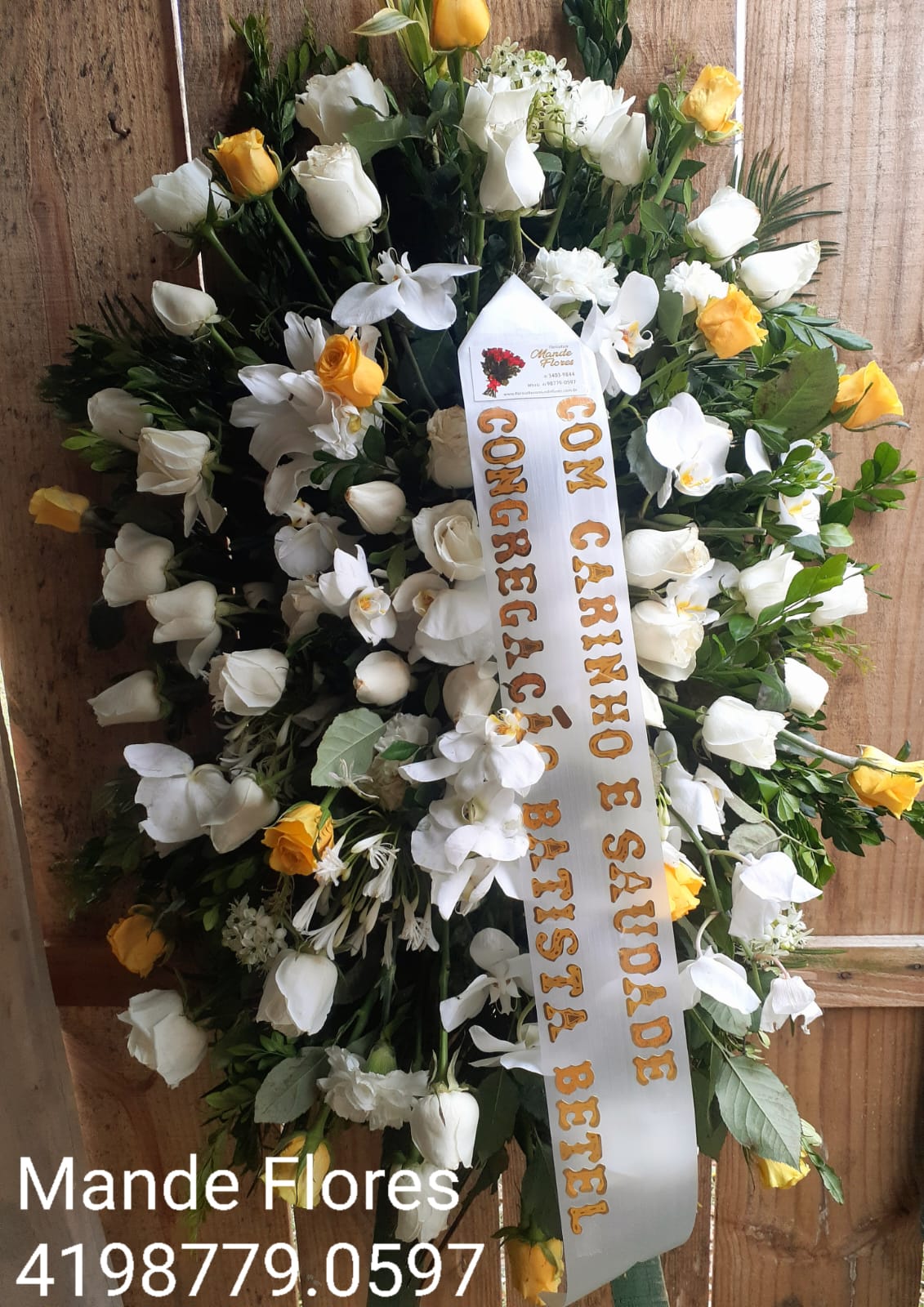 Coroa com dupla cor de rosas brancas e amarelas,. Própria para homenagear criança ou adolescente e pessoas da melhor idade