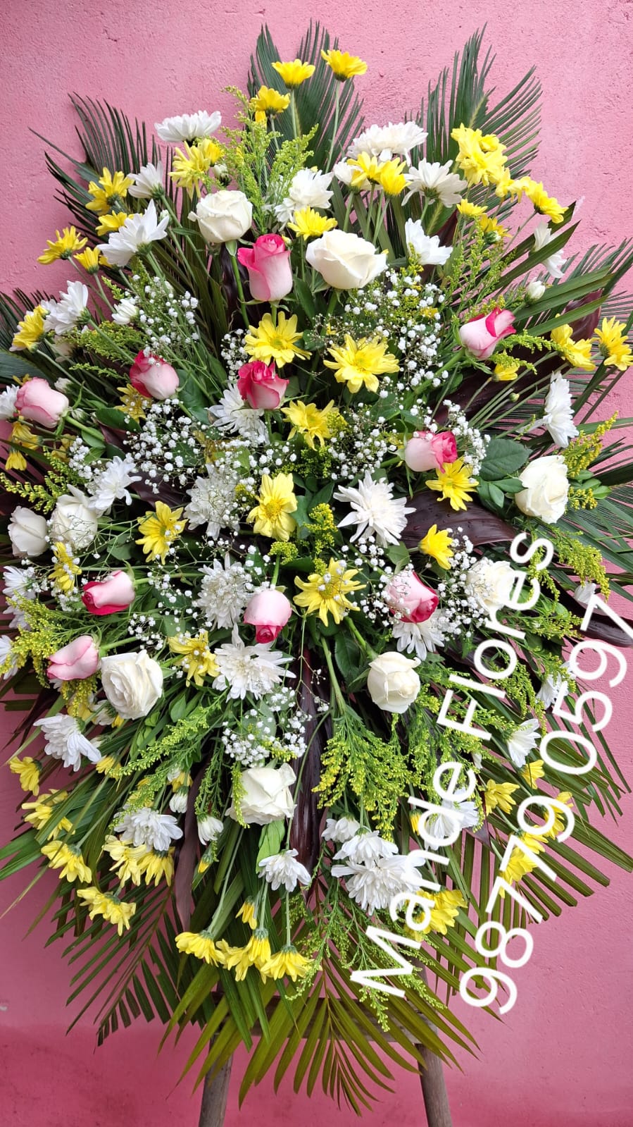 Coroa com variedades de flores, com rosas brancas e cor de rosa. Decorada com mosquitinho e astes de tango. Floricultura Mande Flores com plantão 24 horas para coroas de flores de velório