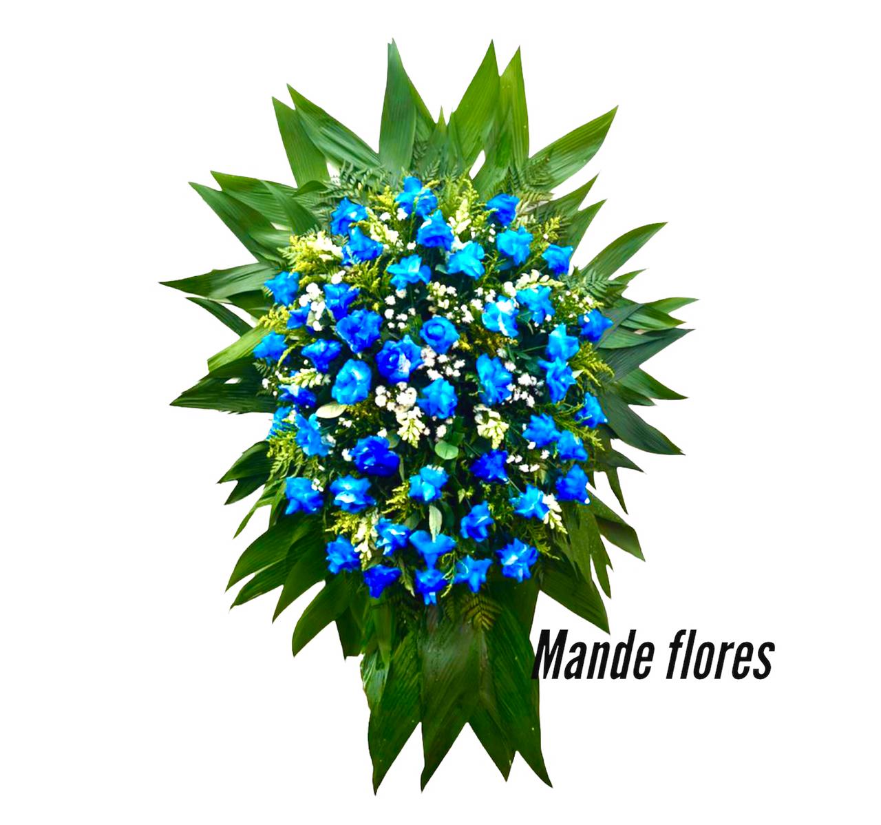 Coroa de flores pra velório com rosas azuis para condolências masculino. Na Mande Flores sua encomenda de coroa para velório chega nas capelas e crematórios dos cemitérios de São José Dos Pinhais, Curitiba e toda Região Metropolitana.