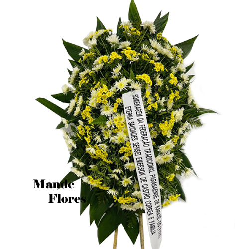 Coroa pra velório branca com variedades de flores. A Mande flores entrega coroas nos salões paroquiais e evangélicas.
