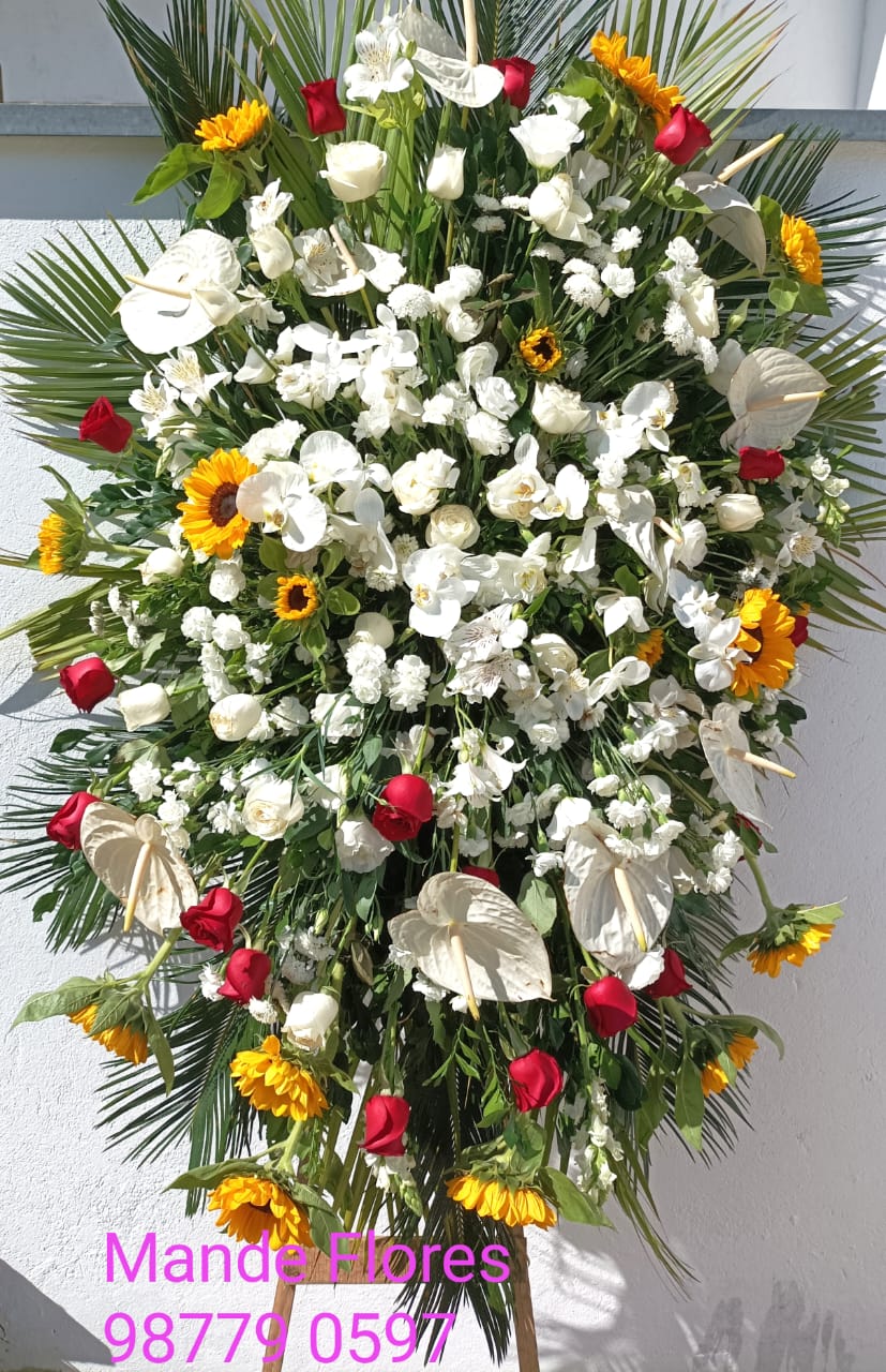 Coroa com representatividade comercial. Com variedades de flores mais os girassóis. Este modelo pode ser confeccionada tanto num tamanho menor ou maior com diferentes preços conforme ajuste junto ao cliente.