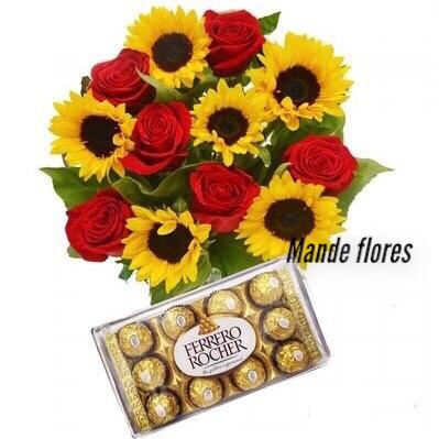 Buquê de rosas com girassóis mais estojo de Ferrero.