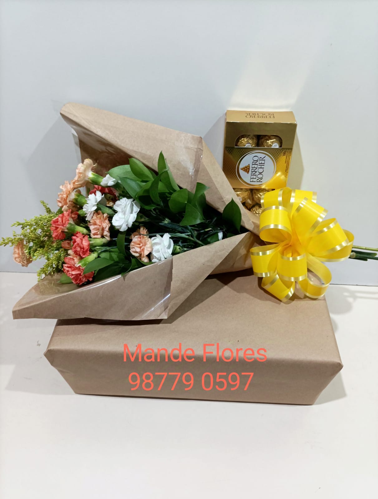 Flores mistas com estojo de chocolate. Se caso preferir somente o arranjo de flores também pode ser sob consulta.