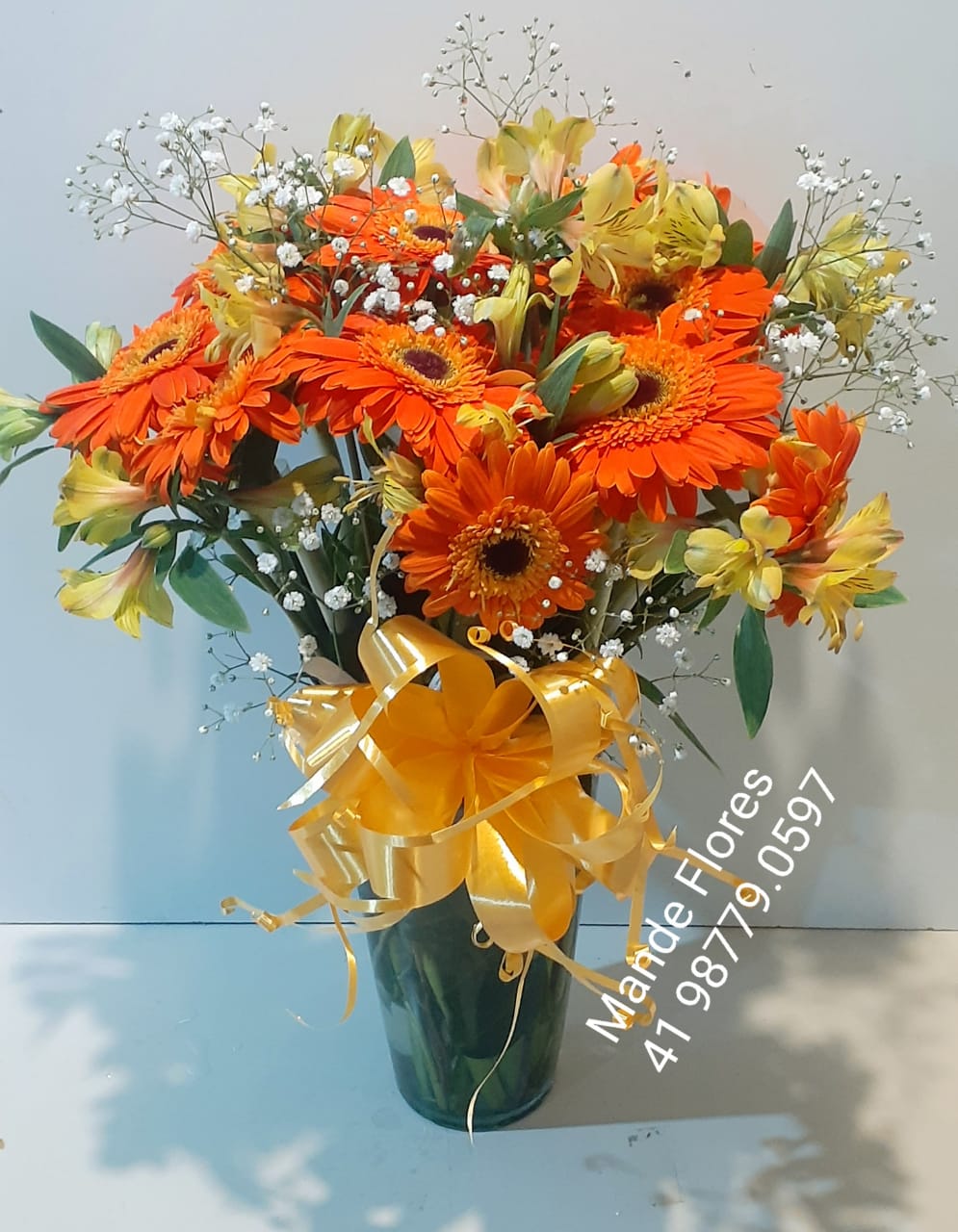 Gérberas no vazo com água. Nesse modelo o vazo acompanha as flores com água. Lindo vazo de vidro com 30cm de altura. Presenteie já com este lindo vazo de vidro com as flores.
