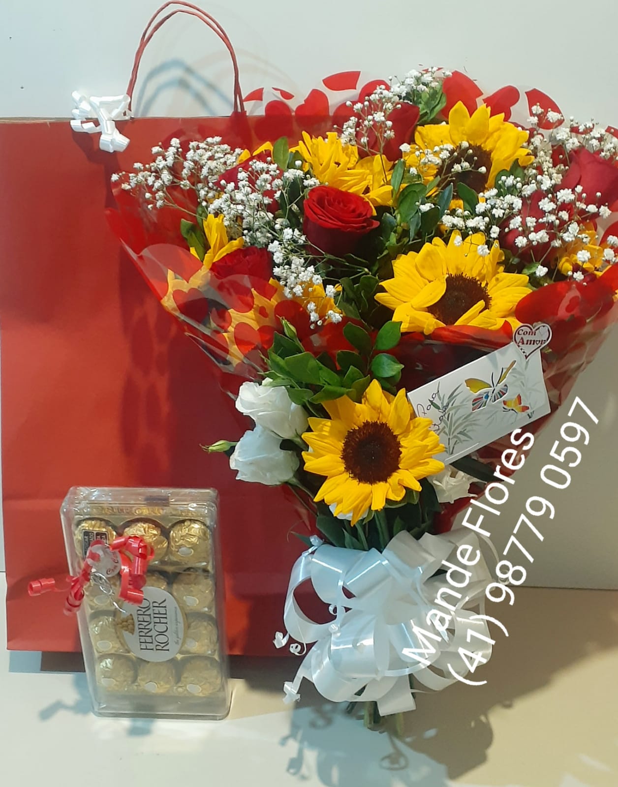 Girassóis com rosas e chocolate. Belo conjunto de flores com estojo de chocolate. Agende sua encomenda para o todo dia especial da mulher.