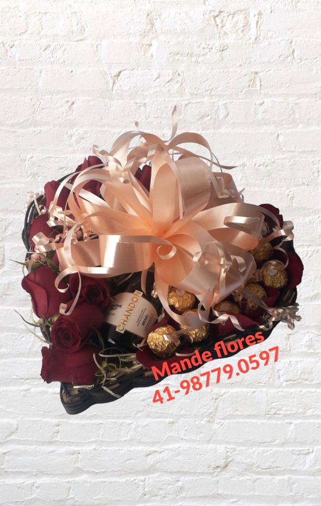 Kit coração com champanhe, chocolate com rosas. Floricultura Mande Flores entrega ainda hoje até as 22H