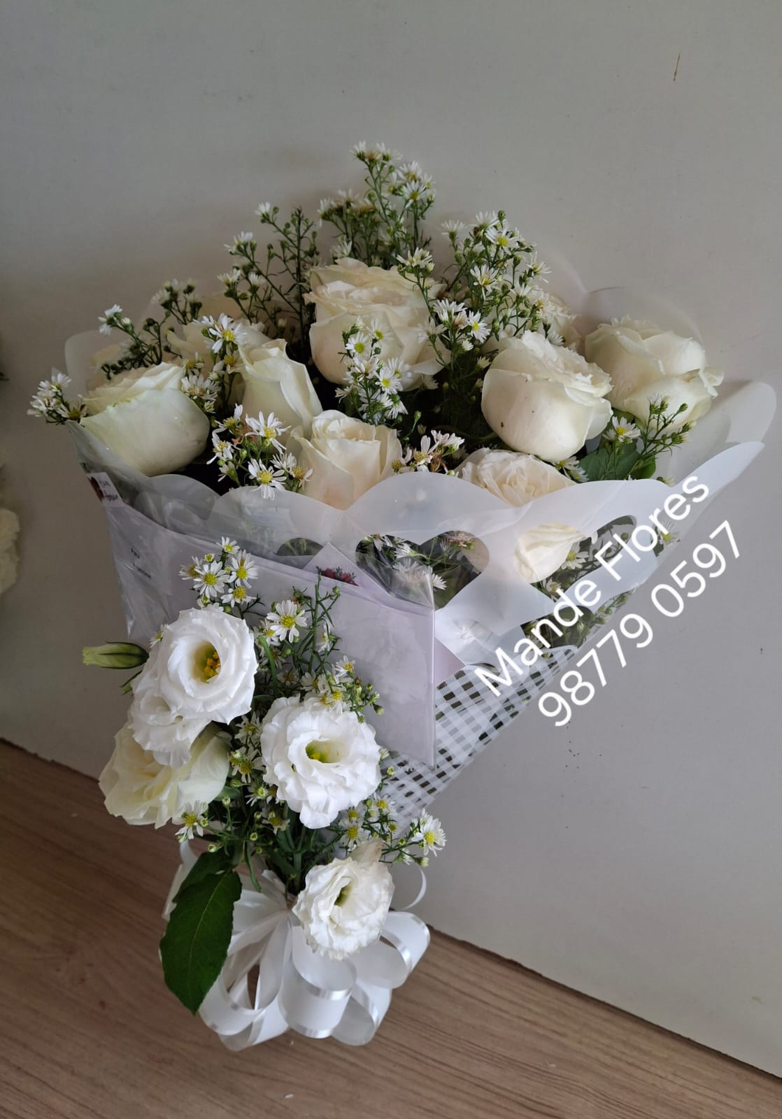 Buque com 12 rosas brancas. Rosas brancas simbolizam paz, felicidade. Bom presentear com rosas, por tantos motivos, variadas cores de rosas. Na floricultura Mande Flores sempre tem a cor certa. Nós intermediamos cada motivo através das flores