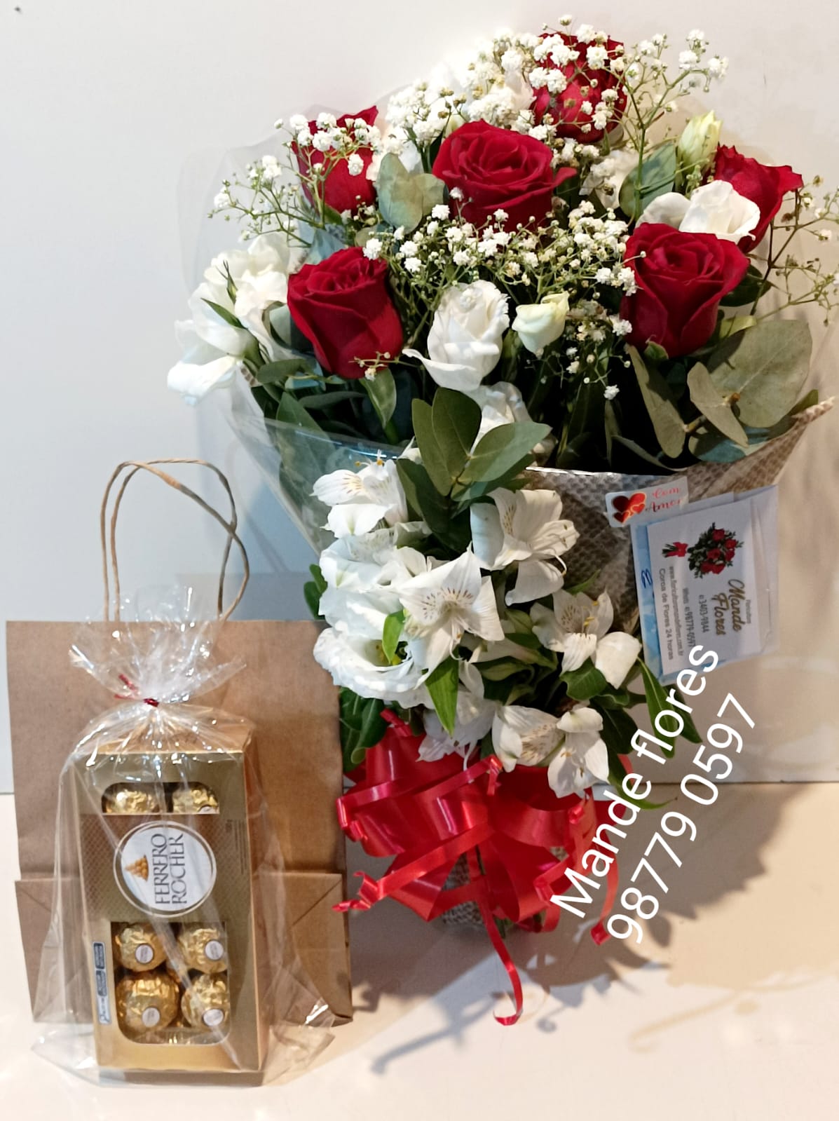 Rosas com estojo de chocolate Ferrero. Doçuras de amor e paixão.