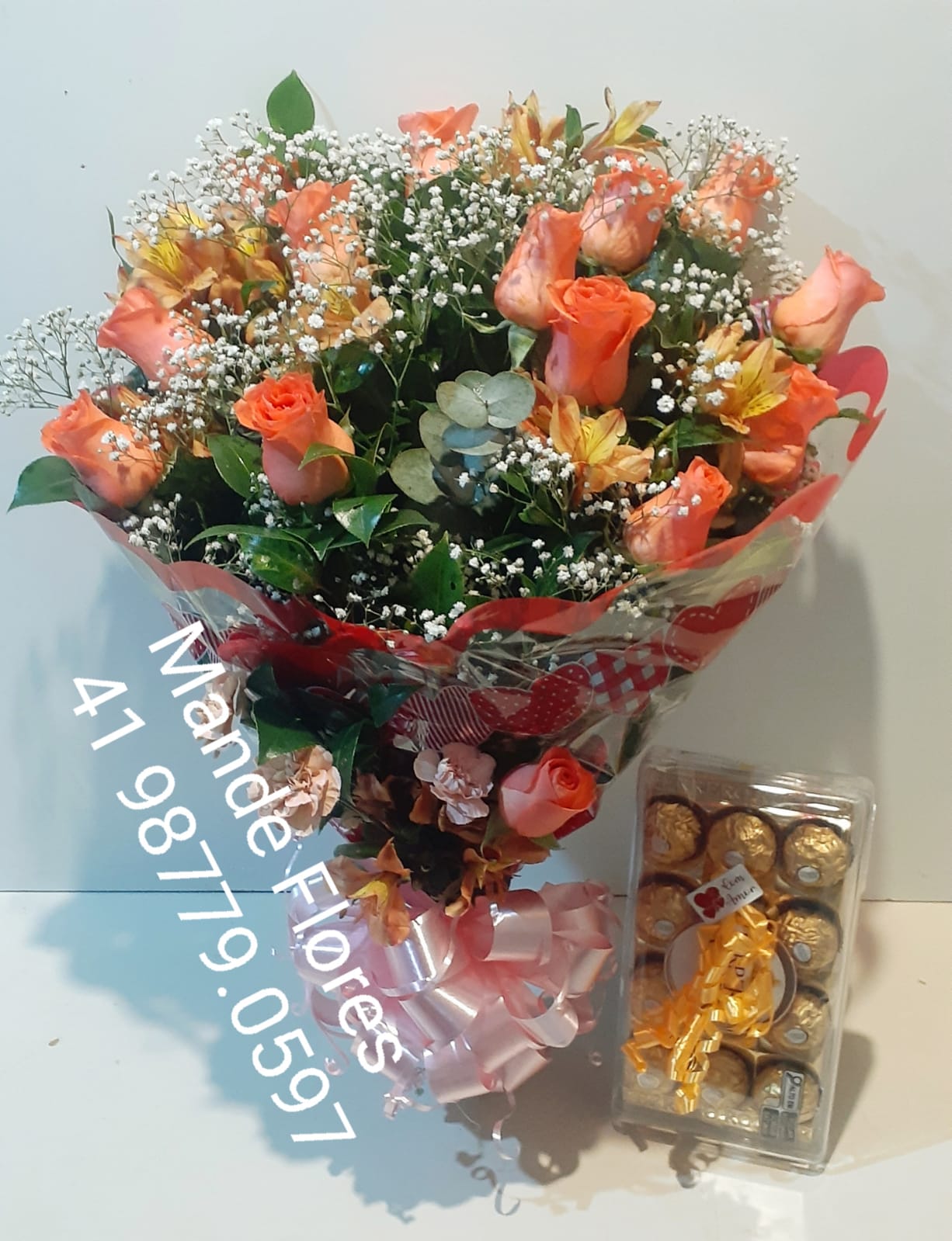 Buquê com as mais lindas rosas coral e um estojo de chocolate Ferrero.